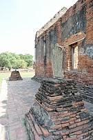 | ワット・ローカヤスッター近くにある堀に囲まれた遺跡。チェディーや堂などがある。建物の入口に木枠がわずかながら残っている。 |