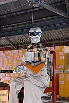 | ヤー・ナーク祠は寺院の奥にある。祠の看板は出ているが、タイ語のみの表記だ(上の写真参照)。祠には、たくさんのナークの肖像画が飾られている。ご本尊の撮影は禁止。 |