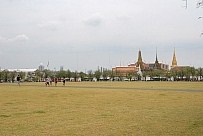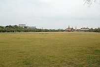Sanam Luang/ท้องสนามหลวง )」に改称した。もともとは王と高貴な王族の火葬場であったが、ラマ3世とラマ4世の時代には外国人観光客に見せるためのライス(米)・フィールドとなった。ラマ5世の時代になると、競馬場、ゴルフ場、凧揚げ場として使用されるようになった。また、ヨーロッパの首都のように、広場内のストリートにはタマリンドの木が植えられた。週末市場として使用されていたこともあるが、現在ではこの市はチャトゥチャックへ移動している。現在は、「豊作儀礼」等、国の行事などでも使用されている。 |