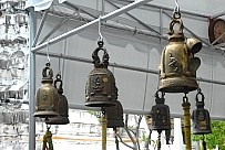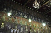 本堂内に描かれている壁画は、ラタナコーシンの王宮が攻撃されている時の想像図だそうだ。また、ご本尊の前に小さな三体の仏像がご本尊に向かって(つまり、参拝者には背を向けて)安置されているのはとても珍しい。 |