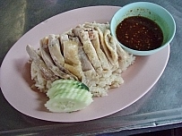 | 蒸し鶏肉のせご飯。屋台でも多く見かける。鶏肉を揚げたバージョンのカオ・マン・カイ・トート(カーオ・マン・カイ・トート)もある。甘辛いたれをかけて食す。スープが付いてくることが多い。 |