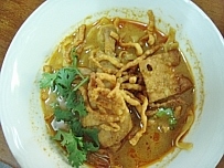 ココナッツ・ミルクを加えたカレー・スープに、揚げた玉子麺を入れたもの。北部地方、特にチェンマイではとても有名。