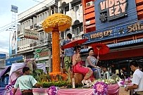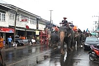 祭りのメインは、ロウソクの山車のパレードとその翌日にある象に乗った僧侶による托鉢。パレードにも象たちは参加する。残念ながら、山車の規模はウボンには遠く及ばない。 |