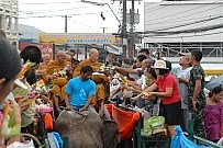 象の高さに合わせた托鉢用の大が接されていて、その上から市民が托鉢を行う。だが、スペースが限られているので、大勢の人で混雑するために台の上に上がるのも大変。もし托鉢に参加したければ、コンビニエンスストアーなどへ行けば缶詰などを詰め合わせた托鉢用のセットが売られている。