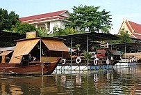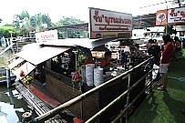 | せっかく水上マーケットに来たのだから、食事をするなら船内レストランがおもしろい。カフェもある。また、有料ではあるが、運河に浮かぶスペースにイスやテーブルを並べ持ち込んだお弁当などが食べられるようにもなっている。 |
