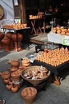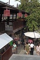 | 土産物店では、いろいろな実演販売を行っている。運河沿いの舞台では、伝統舞踊も披露されている。 |