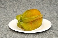 | 果実は、ちょっと黄緑がかった黄色をしている。これを横に切ると、切り口が星の形になっているのがおもしろい。果肉はジューシーだが、味は薄い。 |