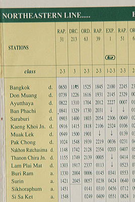 | 左は2015年7月版の北線の時刻表、右は東北線の1995年7月版のものです。1995年7月当時、No.1列車は特急ではなく急行で、バンコク発ウボンラーチャタニー行きだった。 |