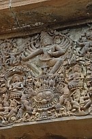 | アンコール・ワット時代の1100~1175年の間に、ヒンドゥー教寺院として建立された。後に、15~16世紀の間に仏教寺院に改装されている。111×115mのU型の池に囲まれており、四角形のプラーン(仏塔)が残っている。それらはラテライトの土台(25×26×1.5m)の上にレンガで造られ、東に面したメインの仏塔は四つの小さな塔に囲まれている。復元されたものかもしれないが、メイン塔には比較的良好な状態のレリーフが残されている。遺跡内は、公園として整備されている。 |